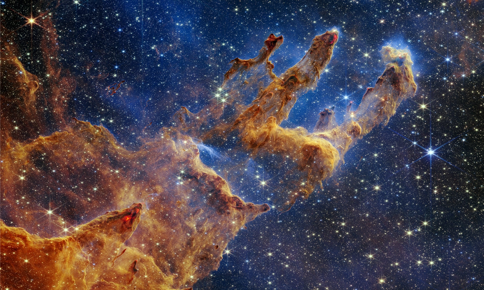The Pillars Of Creation depict new stars forming within dense clouds of gas and dust. Located in the Eagle Nebula, which lies 6,500 light-years away.