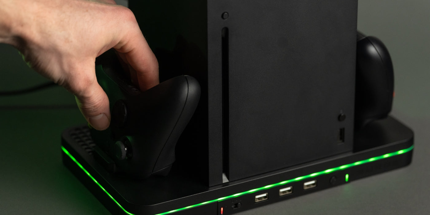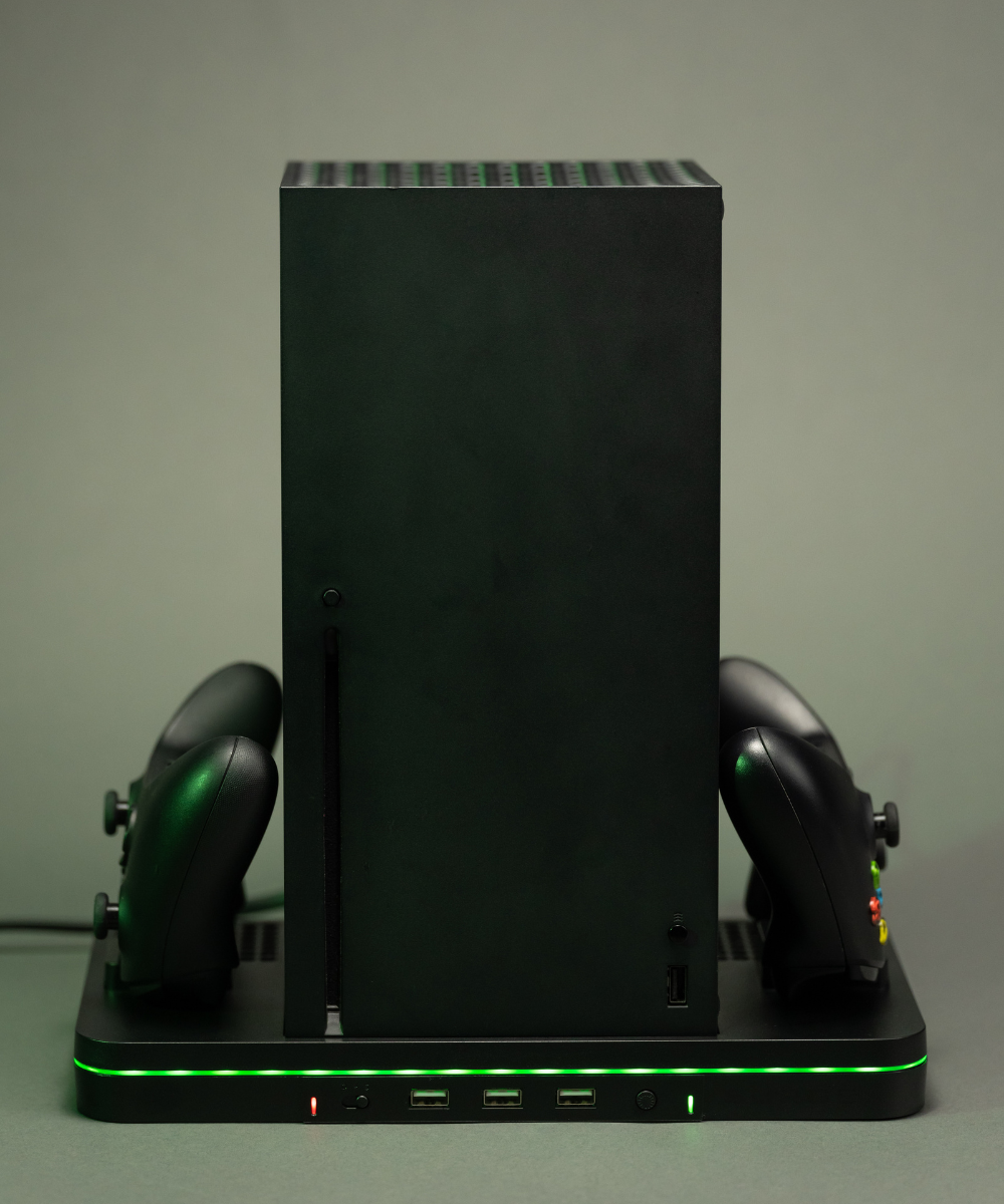 Elevate your gaming experience with the SURGE Charge Stand! Optimized for a streamlined setup, our stand offers dual controller bays, 3 USB 2.0 ports, LED lighting and two cooling fans in the base. Plus, it's compatible with Xbox Series X & S consoles, so you can keep your console and controllers charged, organized, and ready to go! Experience function-first design with the Charge Stand and get ready for the ultimate gaming adventure!