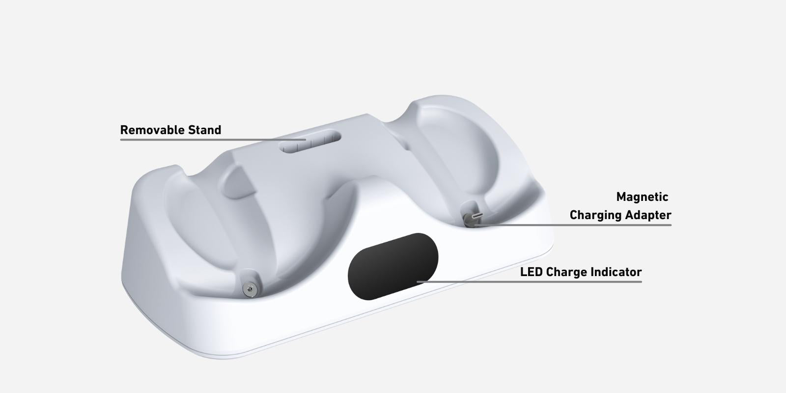 Create a home base for your VR adventures. Our PlayStation VR2 stand connects directly to your console, storing both your PS VR2 Sense Controllers and Headset in a space saving design. Two controller chargers ensure your setup is ready when you are, with convenient LED charging indicators to let you know when you can jump back in. Magnetic USB-C adapters enable a seamless charging experience without needing to plug in any cables. A large headset tray securely holds your PS VR2 Headset without contacting the lenses.