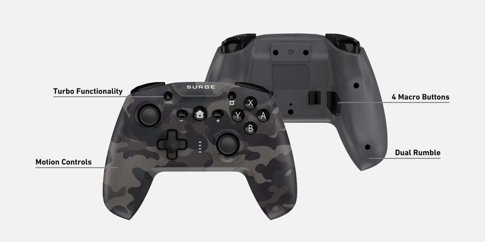 Enhance your gameplay with the Surge SwitchPad Wireless Pro Controller for the Nintendo Switch. The classic style and lightweight design provide continued comfort with undercover features to help you play like a pro. 4 Programmable macro buttons let you pick your own button combinations and assign them to ergonomic paddle buttons on the back of your SwitchPad, giving you increased performance and personalized controls in your favourite games.