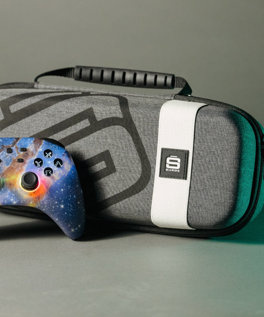 Keep your Nintendo Switch protected and at the ready with the System Case by Surge. With room for your console, games, accessories and a special cutout for the AC adapter, the System Case keeps your whole setup organized and in one place. The mesh pocket is deep enough to hold Joy-Cons or other small accessories. A padded screen guard not only protects your screen but also holds 4 game cartridges. The semi-hard exterior provides protection and a stylish look when taking your setup with you. Ideal for travel and ready to go at a moments notice, protect your Switch setup in a compact size.